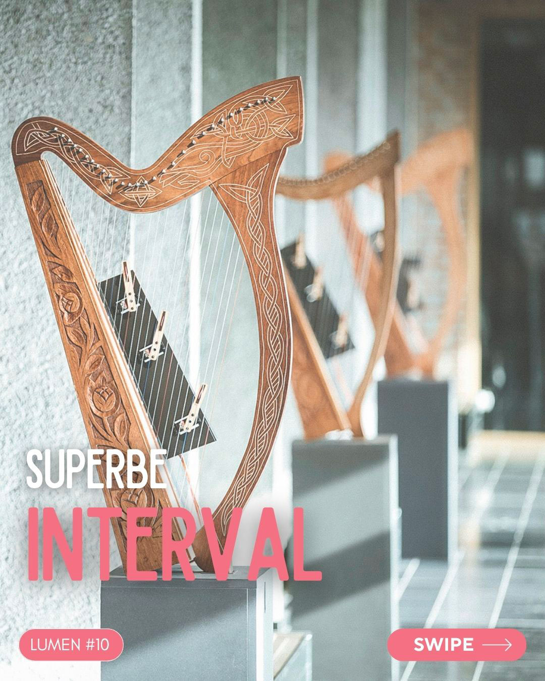 Interval est une installation musicale interactive. L’installation est composée de quatre harpes équipées de mécanismes automatiques, activés uniquement lorsqu’une présence est détectée. Le visiteur qui s’y aventure déclenche les bras rotatifs qui balaient les cordes des instruments.