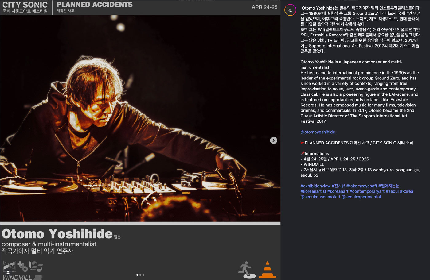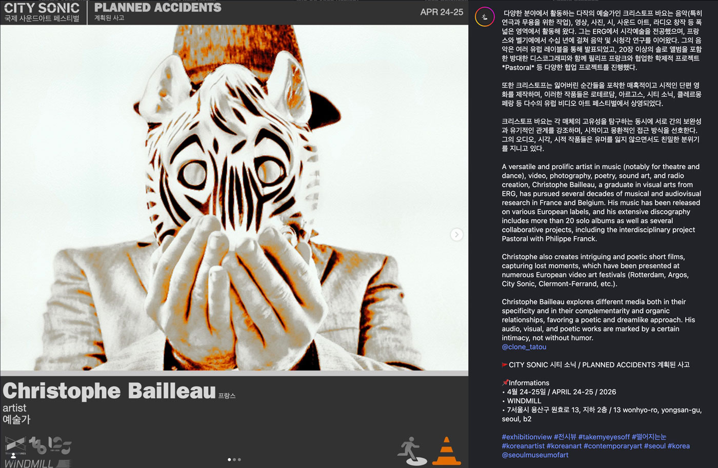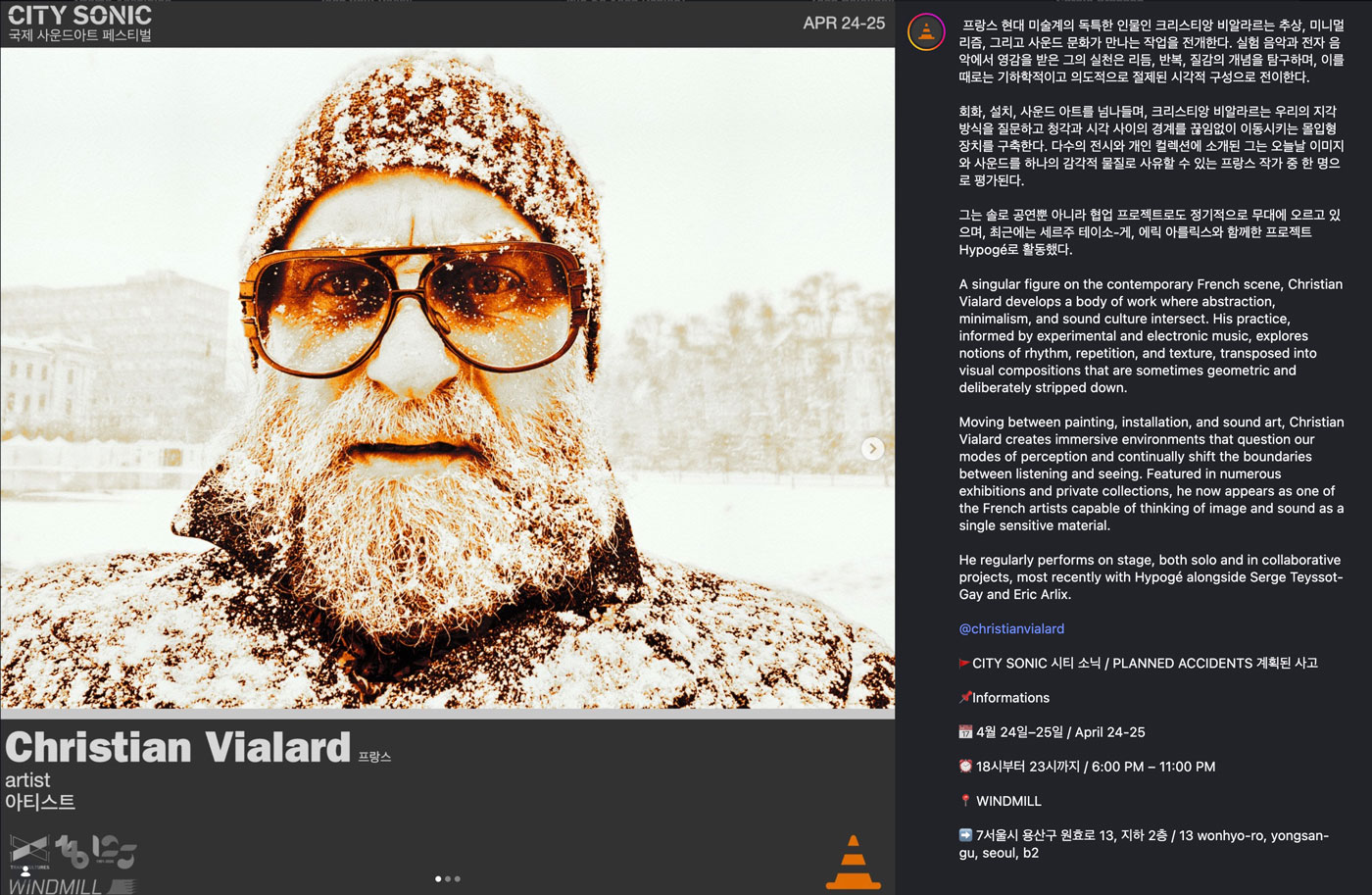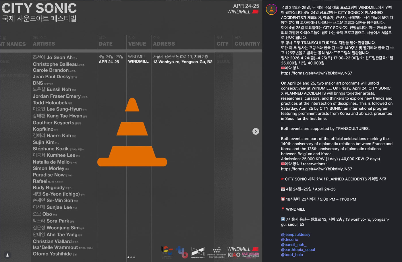 Les 24 et 25 avril 2026, City Sonic s’installe pour la première fois à Séoul, au Windmill, avec deux soirées consacrées aux croisements entre arts sonores, performances, expositions, écoute, projections et concerts. Pensée comme une plateforme internationale de rencontres et d’expérimentations, cette étape coréenne associe, le vendredi 24 avril, City Sonic x Planned Accidents et, le samedi 25 avril, City Sonic, dans un dialogue entre artistes coréens et internationaux issus de champs esthétiques variés.