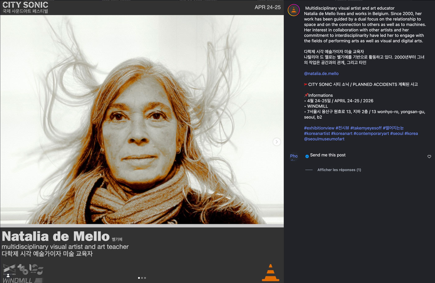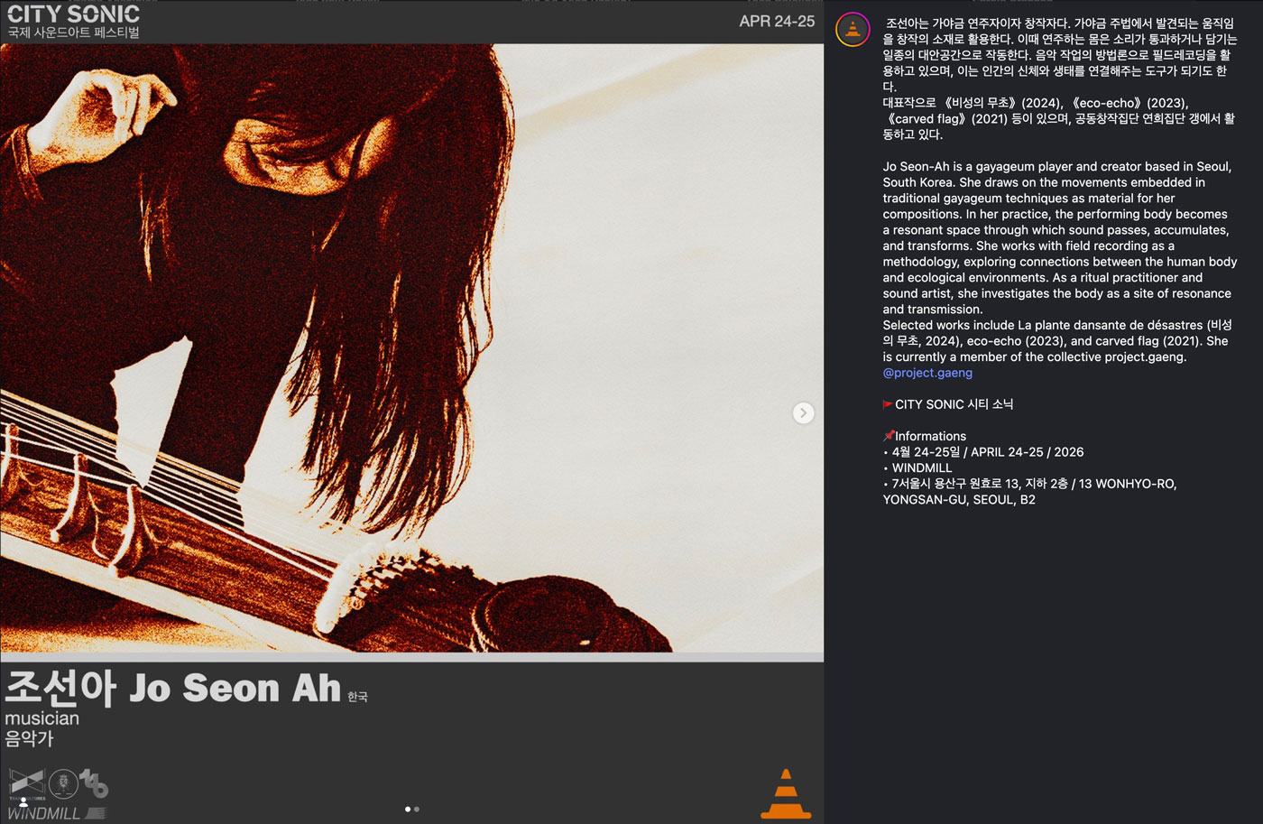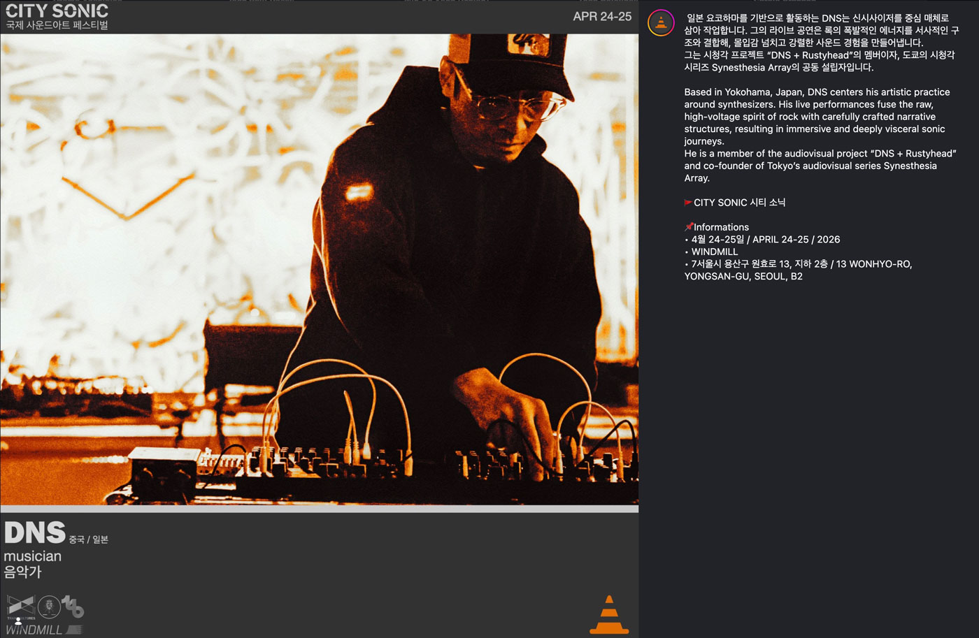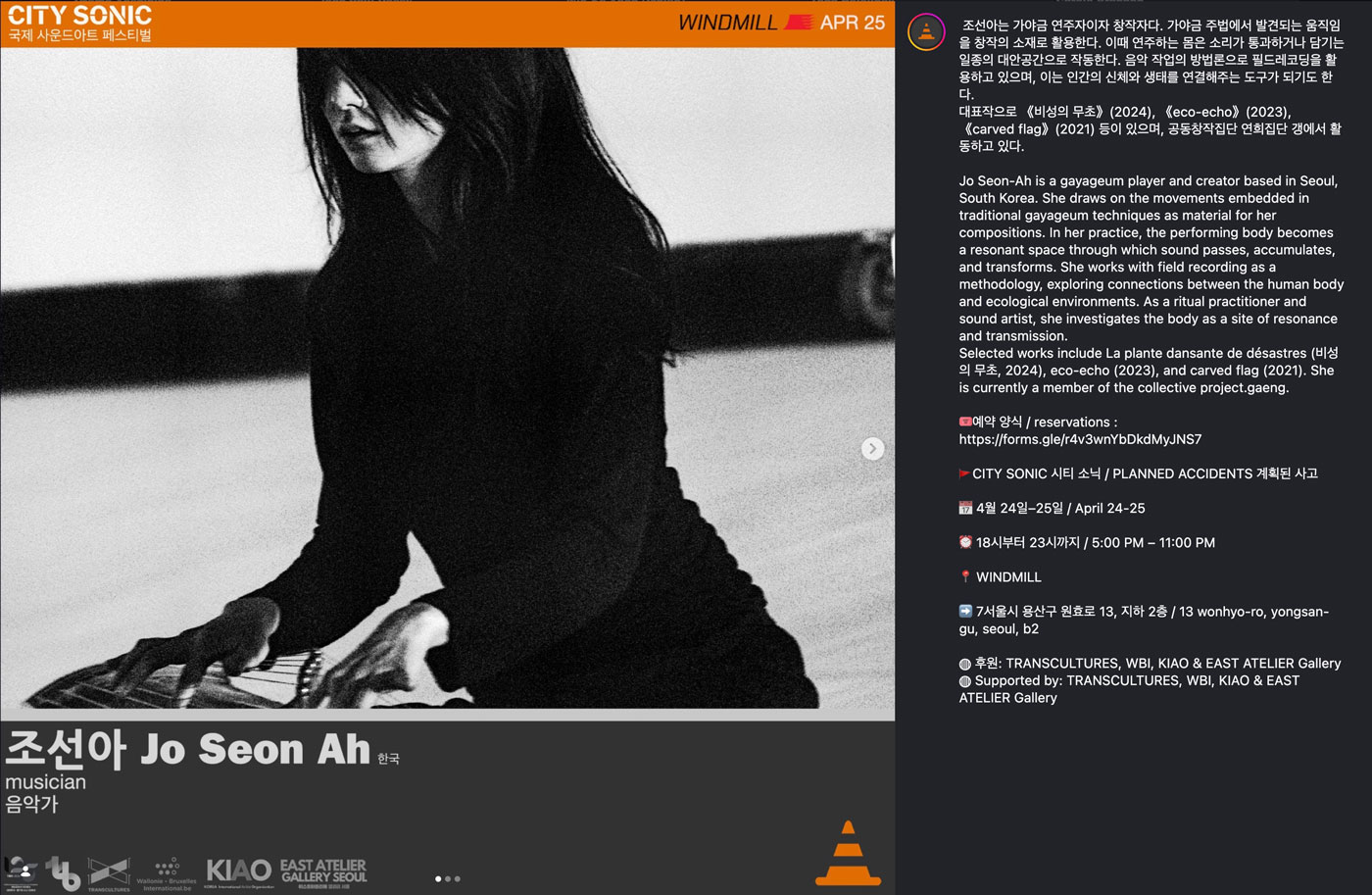Les 24 et 25 avril 2026, City Sonic s’installe pour la première fois à Séoul, au Windmill, avec deux soirées consacrées aux croisements entre arts sonores, performances, expositions, écoute, projections et concerts. Pensée comme une plateforme internationale de rencontres et d’expérimentations, cette étape coréenne associe, le vendredi 24 avril, City Sonic x Planned Accidents et, le samedi 25 avril, City Sonic, dans un dialogue entre artistes coréens et internationaux issus de champs esthétiques variés.