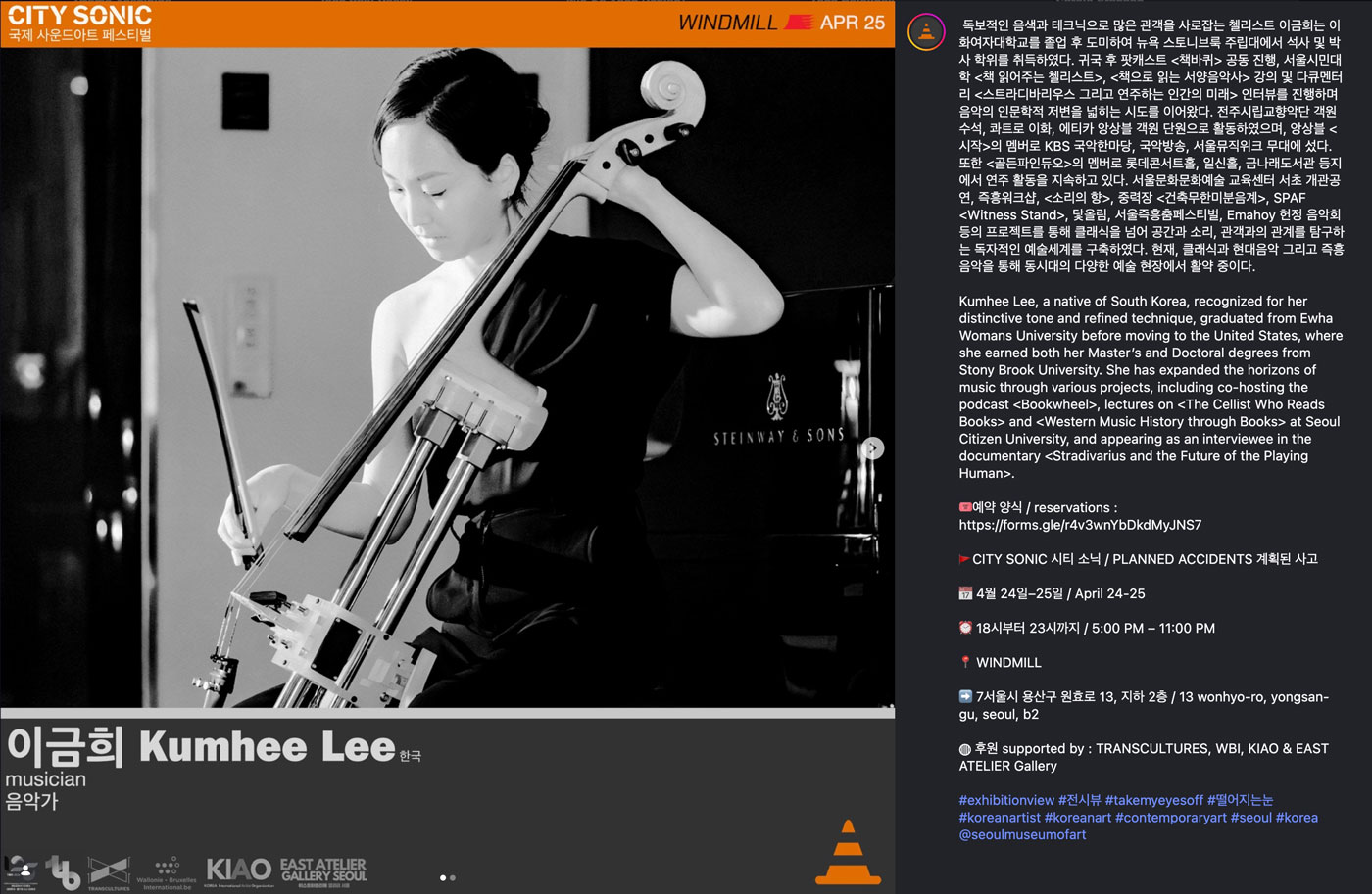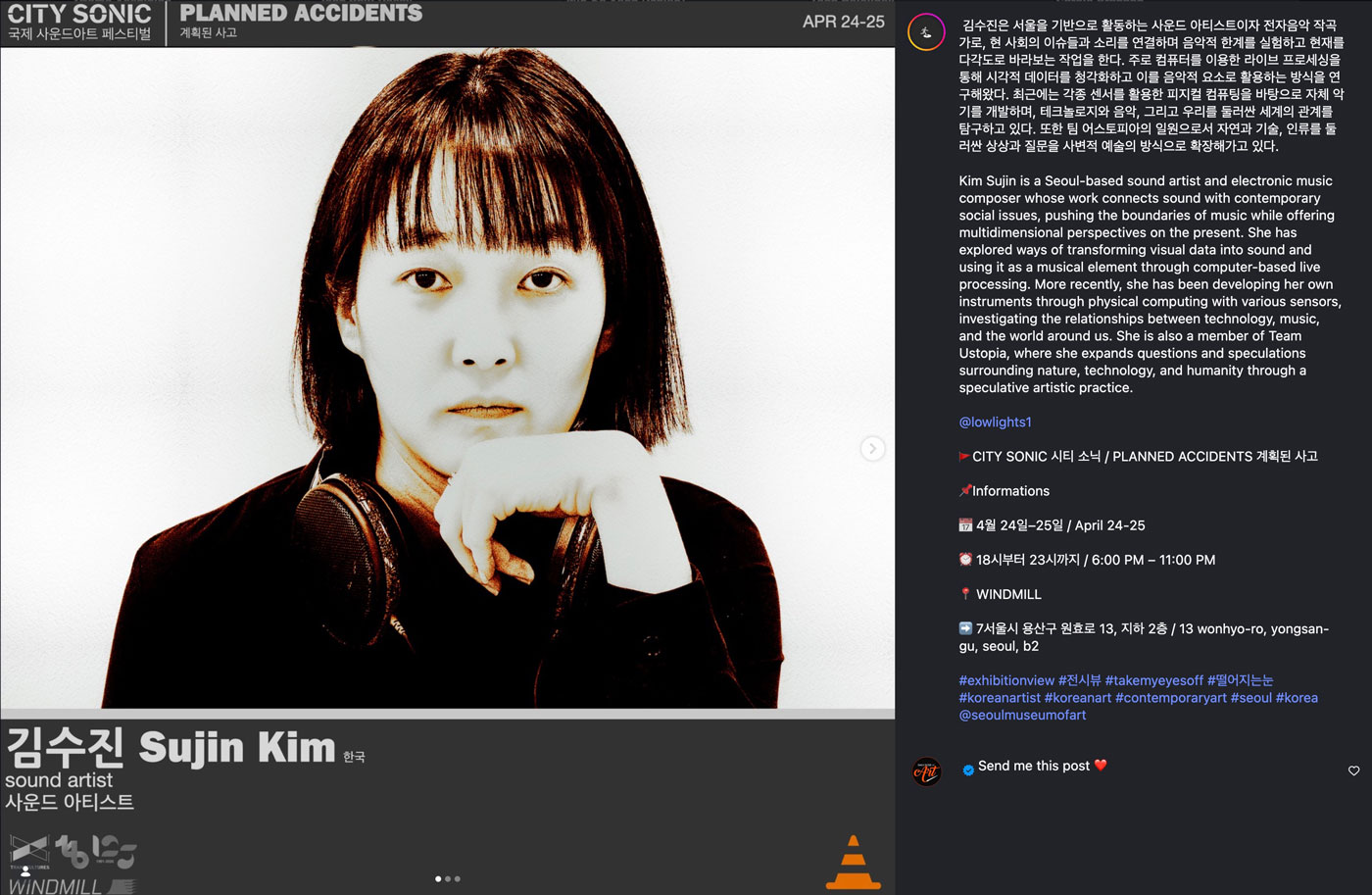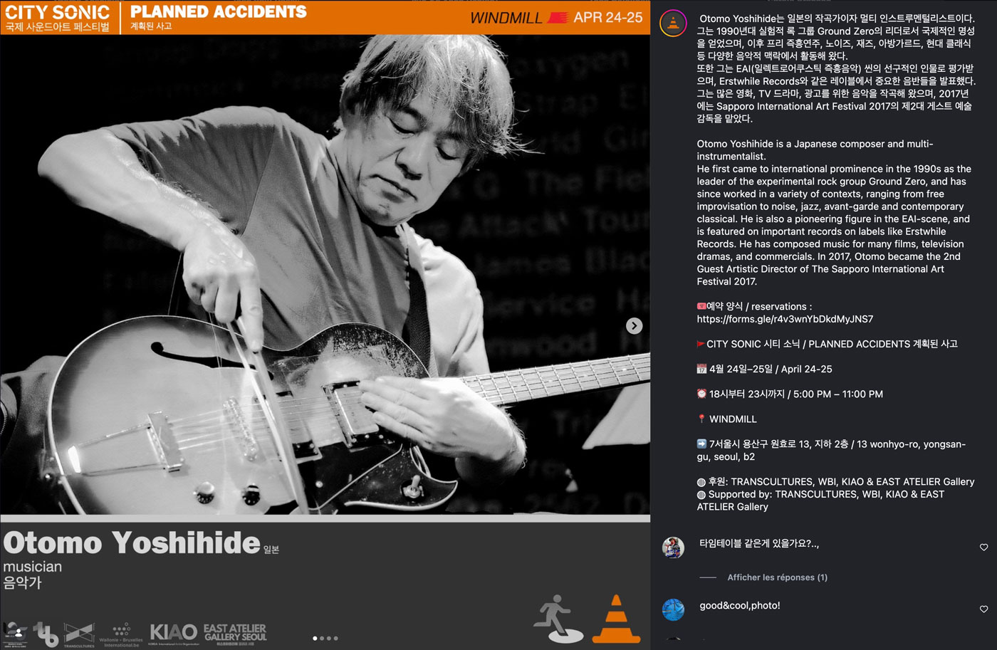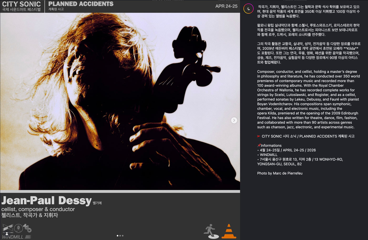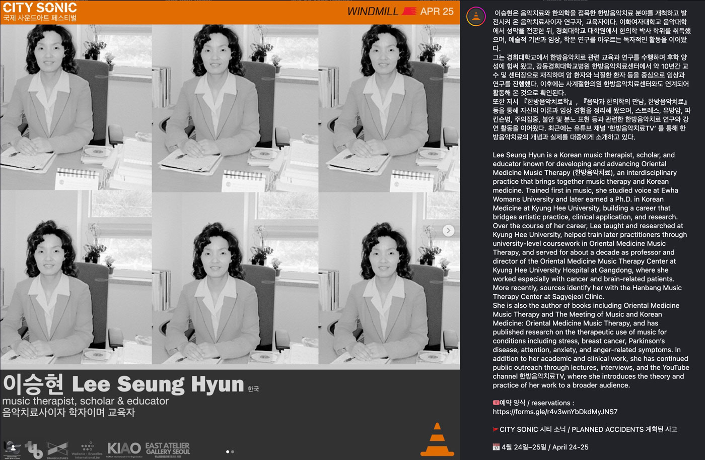 Les 24 et 25 avril 2026, City Sonic s’installe pour la première fois à Séoul, au Windmill, avec deux soirées consacrées aux croisements entre arts sonores, performances, expositions, écoute, projections et concerts. Pensée comme une plateforme internationale de rencontres et d’expérimentations, cette étape coréenne associe, le vendredi 24 avril, City Sonic x Planned Accidents et, le samedi 25 avril, City Sonic, dans un dialogue entre artistes coréens et internationaux issus de champs esthétiques variés.