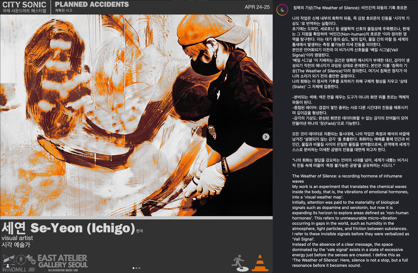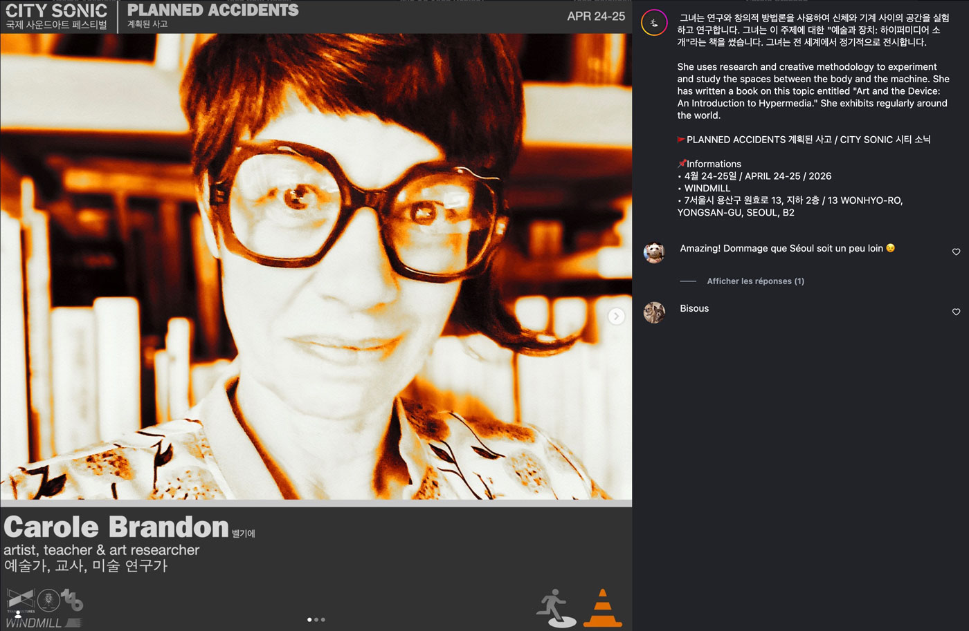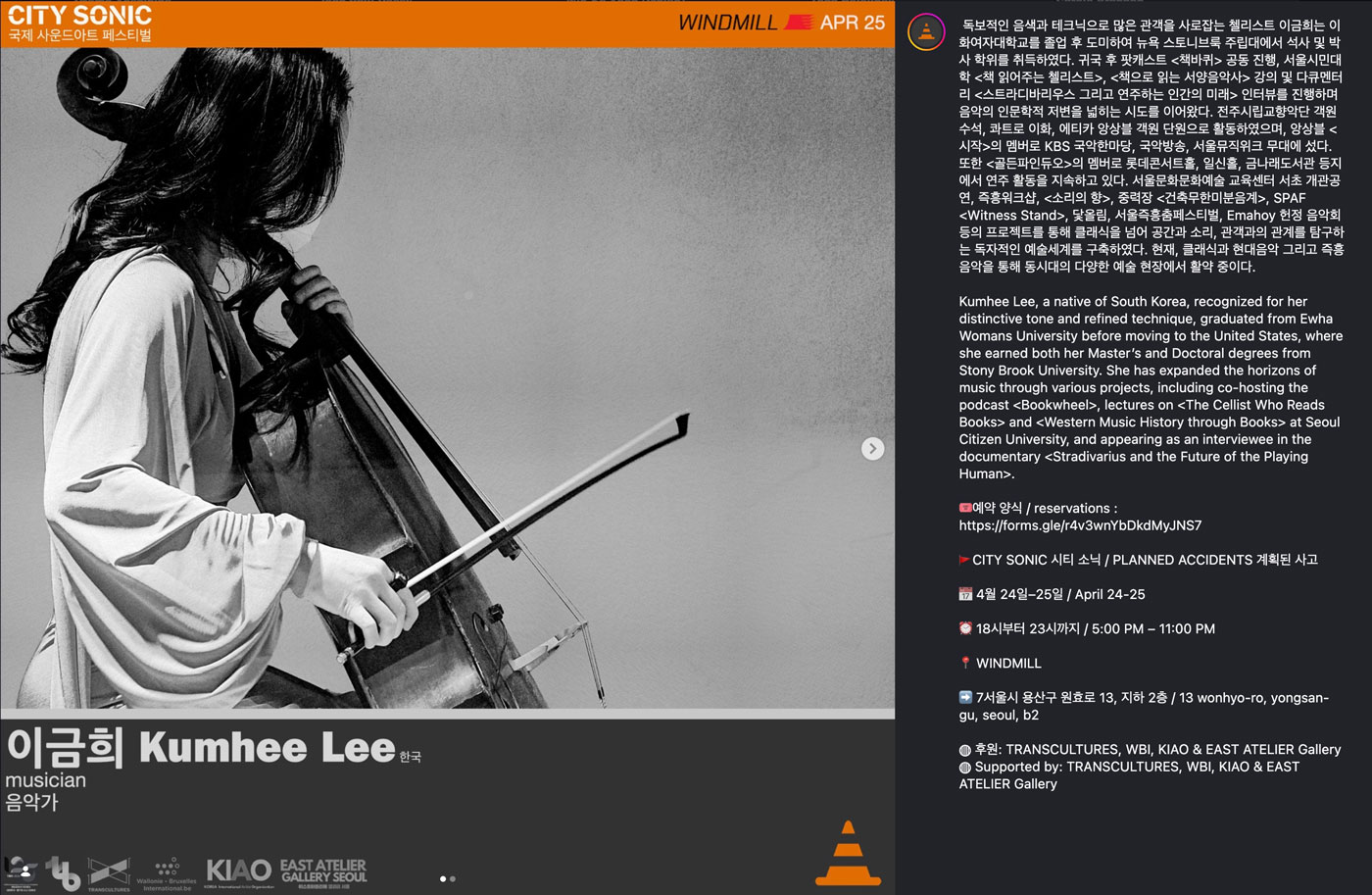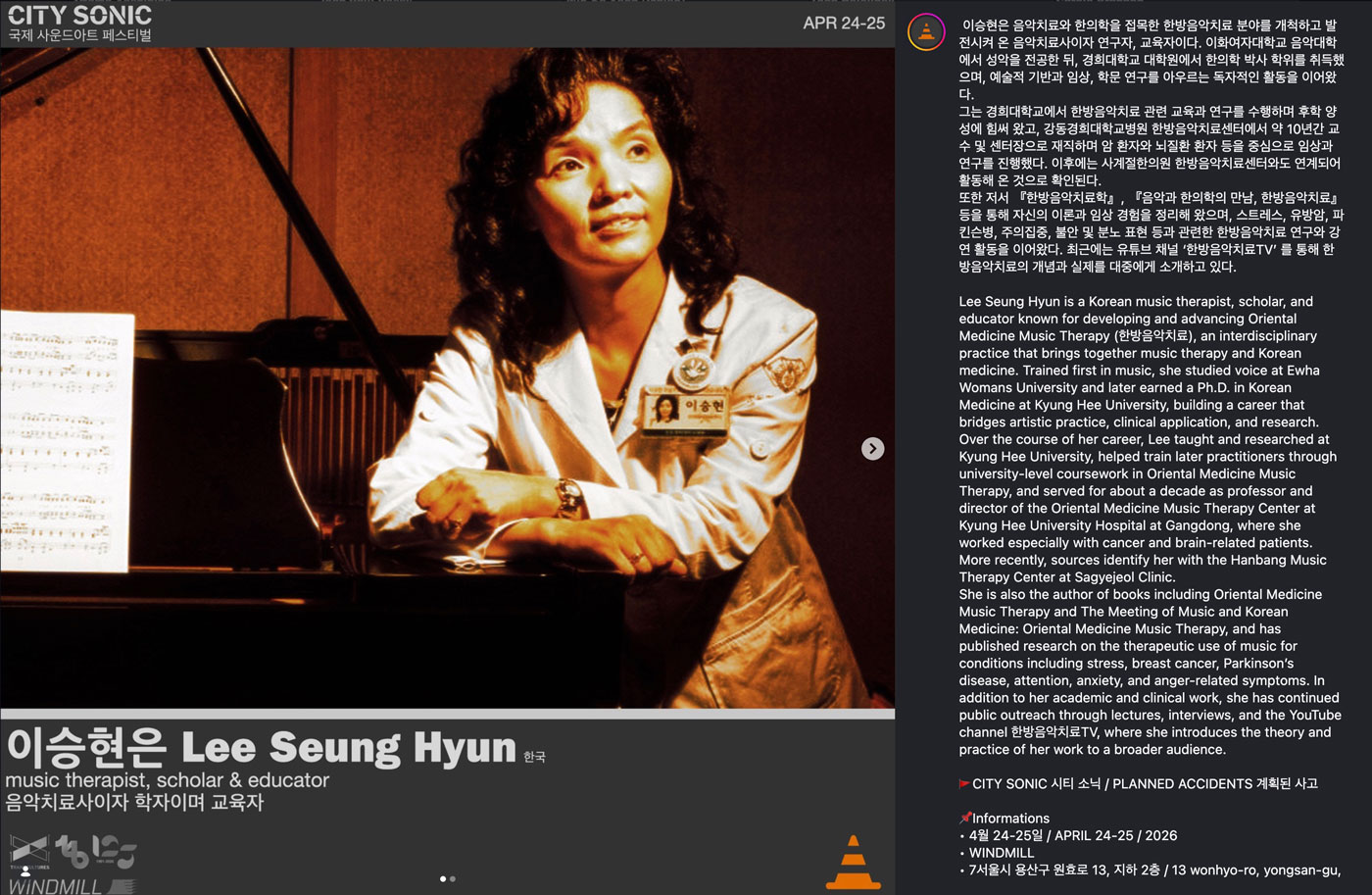 Les 24 et 25 avril 2026, City Sonic s’installe pour la première fois à Séoul, au Windmill, avec deux soirées consacrées aux croisements entre arts sonores, performances, expositions, écoute, projections et concerts. Pensée comme une plateforme internationale de rencontres et d’expérimentations, cette étape coréenne associe, le vendredi 24 avril, City Sonic x Planned Accidents et, le samedi 25 avril, City Sonic, dans un dialogue entre artistes coréens et internationaux issus de champs esthétiques variés.