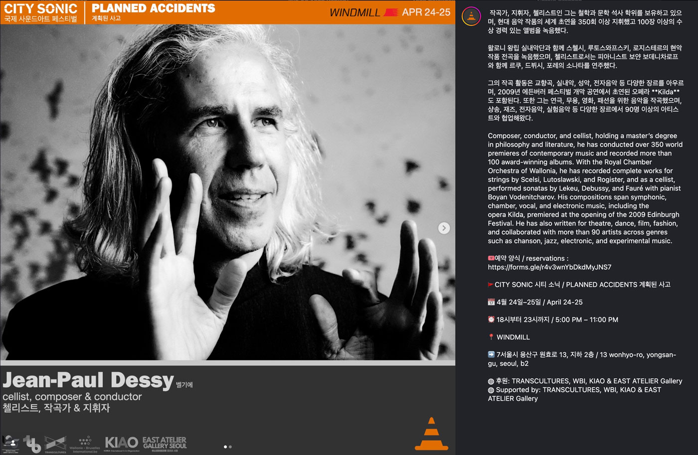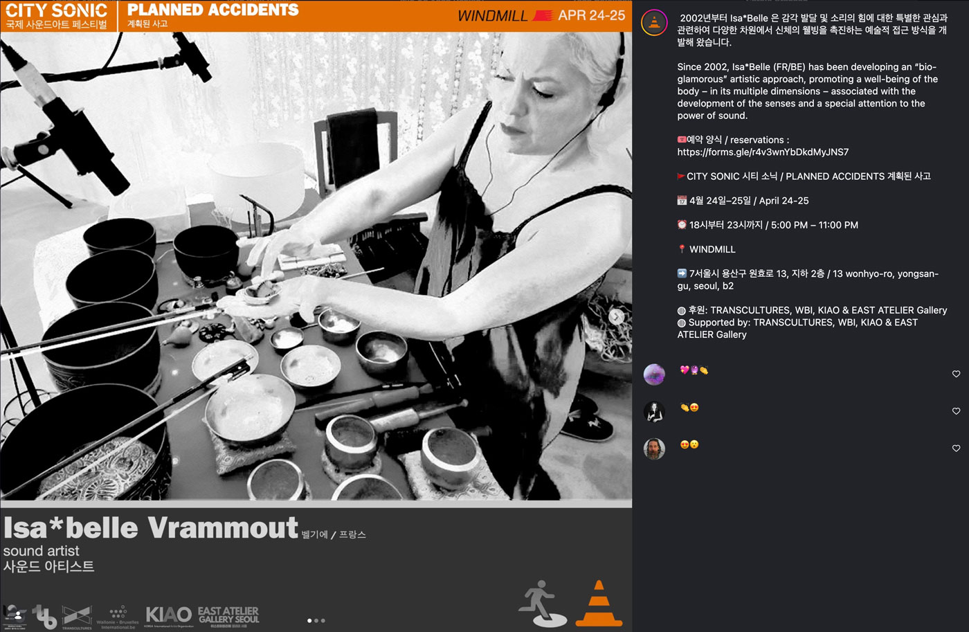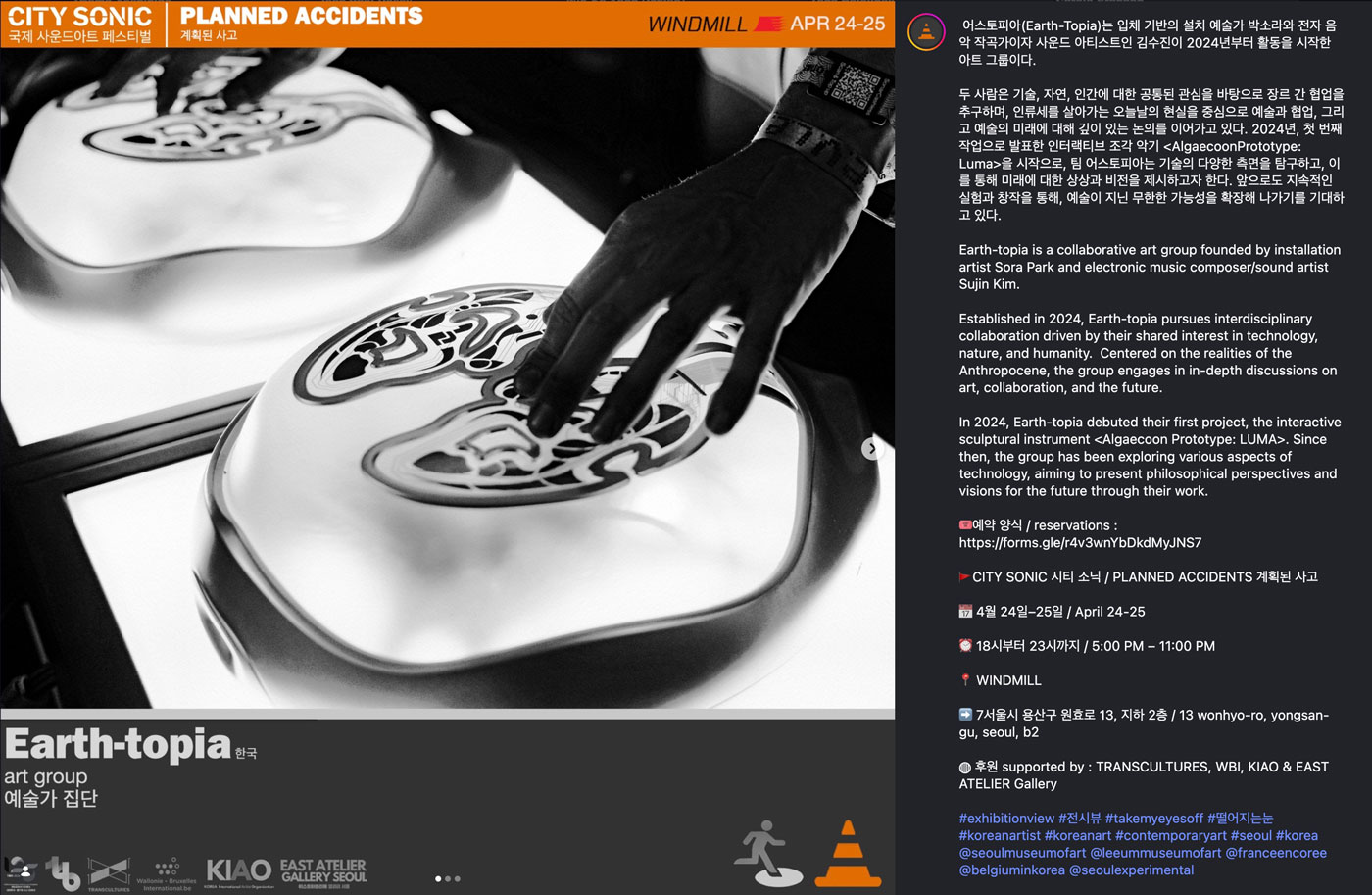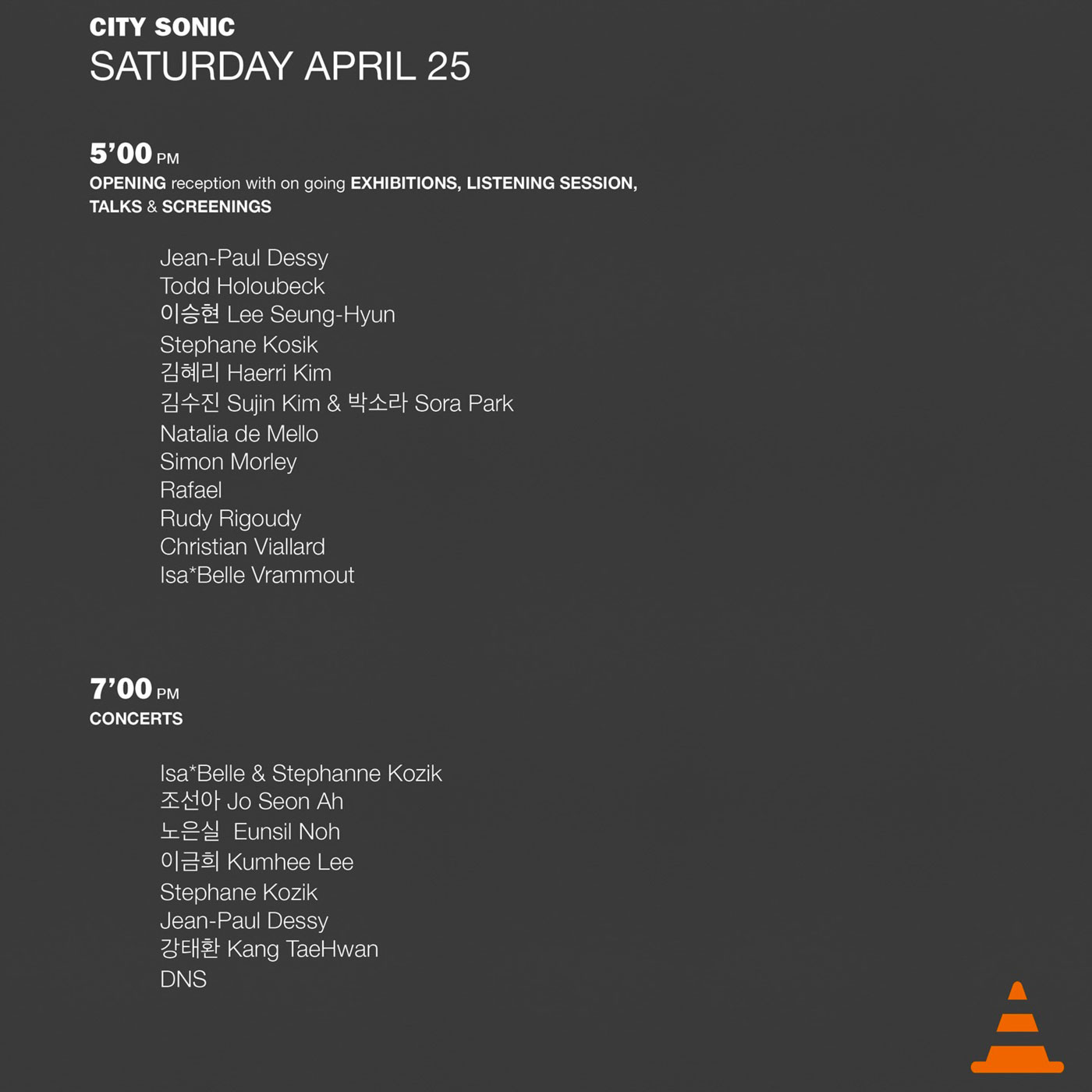 Durant ces deux journées, le public est invité à découvrir un ensemble d’interventions mêlant installations, performances, listening sessions, talks, screenings et concerts, avec la participation d’artistes européens tels que Christophe Bailleau, Carole Brandon, Jean-Paul Dessy, Jordan Fraser Emery, Stéphane Kozik, Natalia de Melo, Paradise Now, Rudy Rigoudy… ainsi que plusieurs autres invités coréens et internationaux.