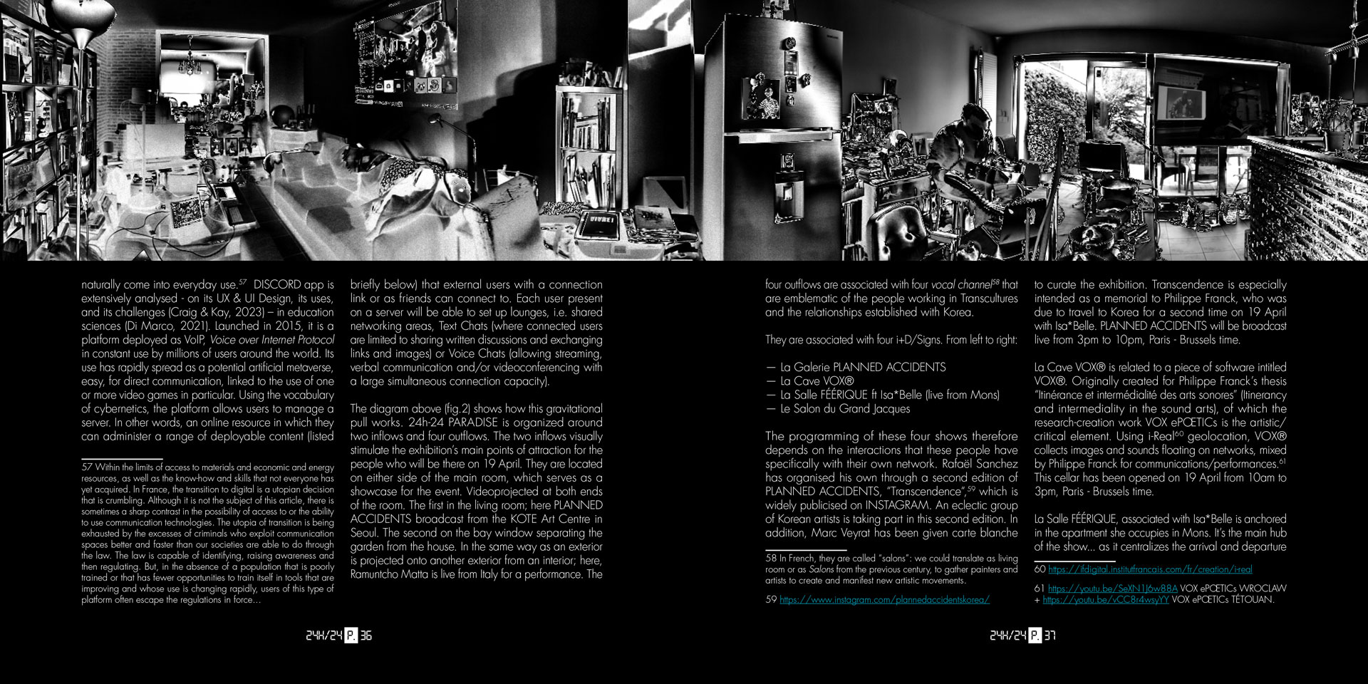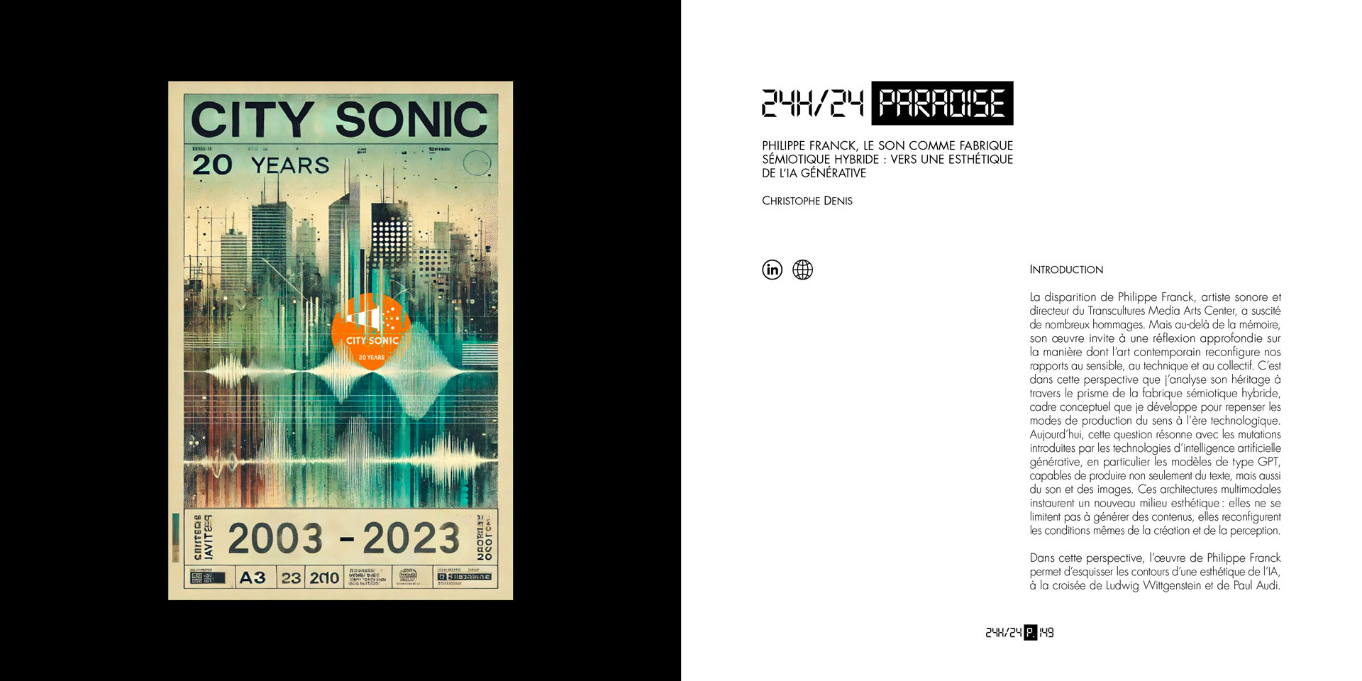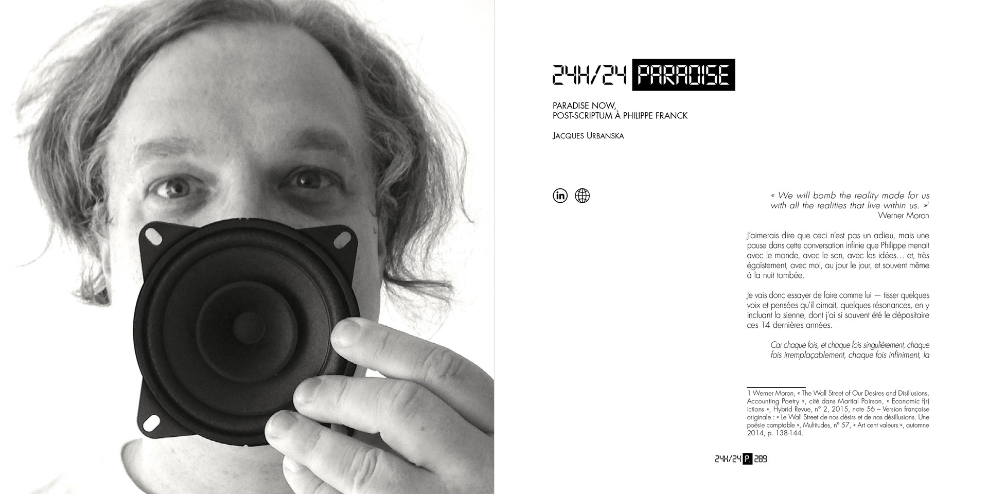 Over the course of its some 300 pages, 24h-24 PARADISE composes a discontinuous cartography in which critical writing, speculative fiction, sound poetry, intimate memories and conceptual scores intertwine, all traversed—directly or in hollow—by the figure of Philippe Franck. The book does not merely document an event: it extends its logics of activation, by disseminating forms, shattering formats, multiplying regimes of discourse. One encounters reflective contributions on post-digital aesthetics, narrative détournements, handwritten tributes, transcriptions of performances, creation protocols, theoretical fragments that elude disciplinary frameworks.