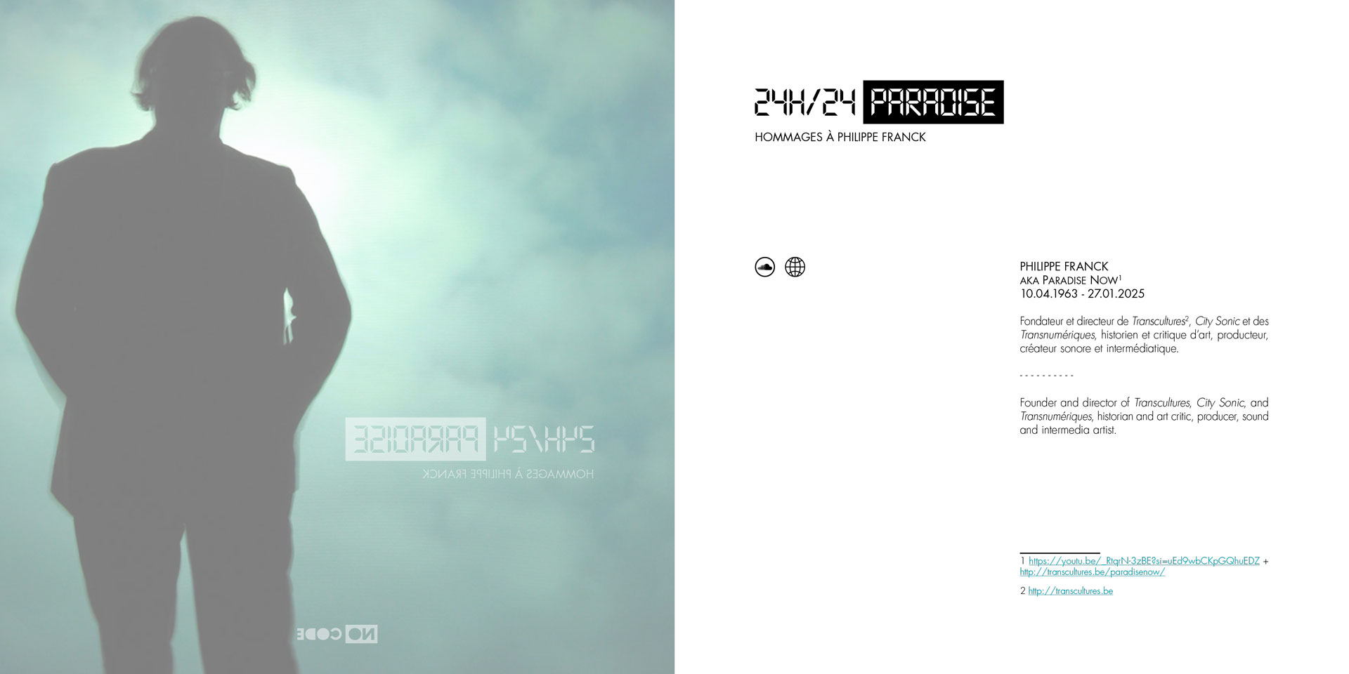 The 24/7_PARADISE catalogue is a bilingual French/English collective volume, at the crossroads of sound and digital arts, research-creation, and a poetico-political tribute. Bringing together artists, theorists, performers and friends of Philippe Franck, a central figure in sound arts and founder of Transcultures, the book orchestrates a polyphony of texts, narratives and essays. Built around the eponymous work— a connected hybrid event between Mons and Seoul— it becomes at once an archive, a manifesto, a laboratory for experimentation and a ritual of memory. Each contribution, whether theoretical, biographical, fictional or performative, extends an aesthetic of the fragment, of flow and of the interstice, sketching a discontinuous territory of affects, networks, sounds and thoughts.