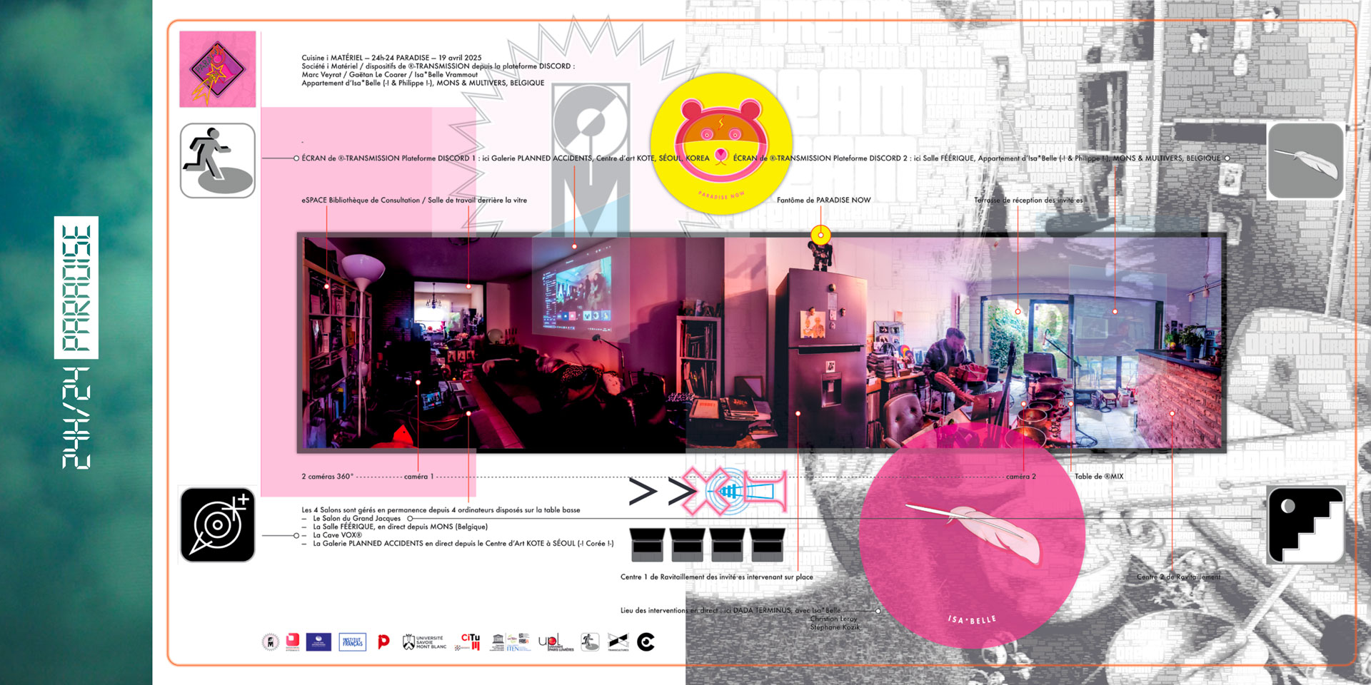 Initiated by Marc Veyrat, Gaëtan Le Coarer, Isa*Belle Vrammout and Société i Matériel, 24h-24 PARADISE was a hybrid artistic and commemorative event that took place in April 2025, simultaneously in Mons (Belgium) and Seoul (South Korea – as part of Planned Accidents #2). It pays tribute to Philippe Franck, sound artist, curator and director of the Transcultures association, who passed away shortly beforehand. The event brought together a group of artists, researchers, performers and friends of Philippe Franck in a dynamic of collective networked creation.